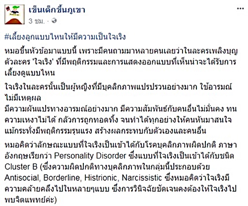 ล่าสุด (21 กันยายน 2560) หมอมินบานเย็น แห่งเพจ เข็นเด็กขึ้นภูเขา ก็ได้เผยแพร่บทความน่าสนใจ ในหัวข้อ "เลี้ยงลูกแบบไหนให้มีความเป็นใจเริง" เนื่องจากหลายคนถามว่า ตัวละคร ใจเริง ในละคร เพลิงบุญ ที่มีพฤติกรรมและการแสดงออกแบบในเรื่องนั้น น่าจะได้รับการเลี้ยงดูมาแบบไหน