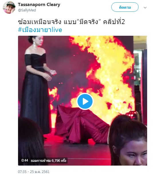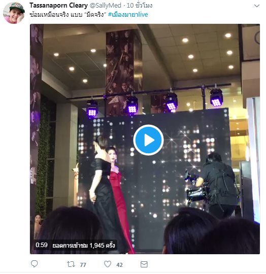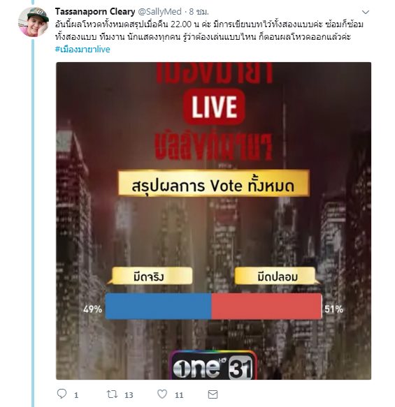 สำหรับตอนจบแบบใช้มีดจริง ทางคุณ @SallyMed เผยว่า "ตอนจบของมีดจริงคือ ภาวิดาถูกรัญชลีแทงกลับ แล้วตกเวทีไปทั้งคู่ค่ะ #เมืองมายาLive"
