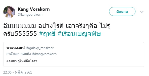 ทั้งนี้เมื่อมีแฟน ๆ ถามหนุ่ม กั้ง วรกร ผู้รับบท ฤทธิ์ ถึงเรื่องดังกล่าว เจ้าตัวก็ตอบเพียงว่า "อืมมมมมมม อย่างไรดี เอาจริง ๆ คือ ไม่รู้ครับ 555555 #ฤทธิ์ #เรือนเบญจพิษ"