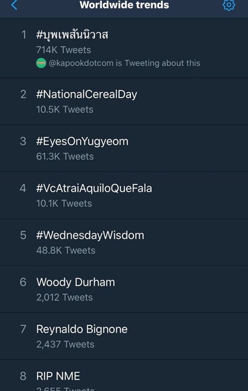 แต่ล่าสุด (7 มีนาคม 2561) ดูเหมือนความแรงของ #บุพเพสันนิวาส จะไม่หยุดอยู่แค่ไทยเทรนด์เท่านั้น เพราะเมื่อไปเช็กเทรนด์โลก ก็พบว่าแฮชแท็กดังกล่าว ขึ้นอันดับ 1 ด้วยเช่นกัน ซึ่งหมายความว่า ในทวิตเตอร์มีคนพูดถึง #บุพเพสันนิวาส มากเป็นอันดับ 1 ของโลกเลยทีเดียว