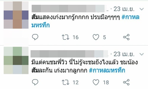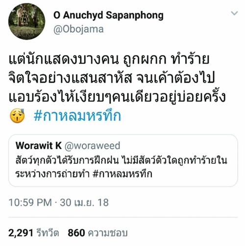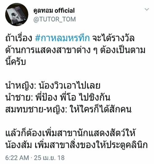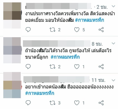 งานนี้หลายคนเลยอยากให้มีรางวัลนักแสดงสัตว์ยอดเยี่ยม และอยากจะขอมอบรางวัลนี้ให้กับ "น้องส้ม" เพราะแสดงได้เก่งและน่าชมจริง ๆ และสำหรับใครที่เป็นห่วงน้องส้ม กลัวว่าการแสดงฉากตายจะมีการทำอะไรสัตว์หรือเปล่านั้น ก็เบาใจได้ เพราะทางผู้กำกับ กาหลมหรทึก ยืนยันว่า สัตว์ทุกตัวได้รับการฝึกฝน และไม่มีสัตว์ตัวใดถูกทำร้ายในการถ่ายทำแต่อย่างใด