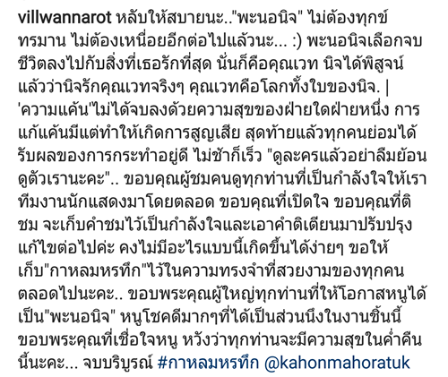 "หลับให้สบายนะ.. "พะนอนิจ" ไม่ต้องทุกข์ทรมาน ไม่ต้องเหนื่อยอีกต่อไปแล้วนะ... :) พะนอนิจเลือกจบชีวิตลงไปกับสิ่งที่เธอรักที่สุด นั่นก็คือคุณเวท นิจได้พิสูจน์แล้วว่านิจรักคุณเวทจริง ๆ คุณเวทคือโลกทั้งใบของนิจ. | \'ความแค้น\' ไม่ได้จบลงด้วยความสุขของฝ่ายใดฝ่ายหนึ่ง การแก้แค้นมีแต่ทำให้เกิดการสูญเสีย สุดท้ายแล้วทุกคนย่อมได้รับผลของการกระทำอยู่ดี ไม่ช้าก็เร็ว "ดูละครแล้วอย่าลืมย้อนดูตัวเรานะคะ".. ขอบคุณผู้ชมคนดูทุกท่านที่เป็นกำลังใจให้เราทีมงานนักแสดงมาโดยตลอด ขอบคุณที่เปิดใจ ขอบคุณที่ติชม จะเก็บคำชมไว้เป็นกำลังใจและเอาคำติเตียนมาปรับปรุงแก้ไขต่อไปค่ะ คงไม่มีอะไรแบบนี้เกิดขึ้นได้ง่าย ๆ ขอให้เก็บ "กาหลมหรทึก" ไว้ในความทรงจำที่สวยงามของทุกคนตลอดไปนะคะ.. ขอบพระคุณผู้ใหญ่ทุกท่านที่ให้โอกาสหนูได้เป็น "พะนอนิจ" หนูโชคดีมาก ๆ ที่ได้เป็นส่วนนึงในงานชิ้นนี้ ขอบพระคุณที่เชื่อใจหนู หวังว่าทุกท่านจะมีความสุขในค่ำคืนนี้นะคะ... จบบริบูรณ์ #กาหลมหรทึก @kahonmahoratuk"