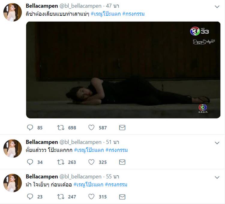 เท่านั้นยังไม่พอ ในตอนล่าสุดของละคร กรงกรรม นางเอกสาว เบลล่า ราณี ยังเผยแฮชแท็กของคืนนี้ (5 มีนาคม 2562) ว่าให้ใช้ #เรณูโป๊ะแตก ก่อนที่เรื่องราวความโป๊ะแตกของเรณูจะปรากฏขึ้นมา เมื่อความจริงเปิดเผยว่า แท้จริงแล้วเธอไม่ได้ท้อง เพราะมีประจำเดือนทะลุผ้าออกมาให้เห็น