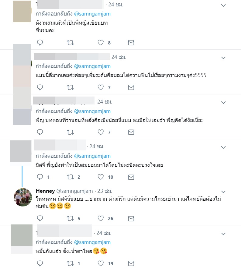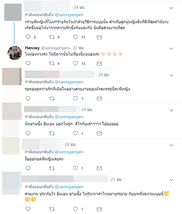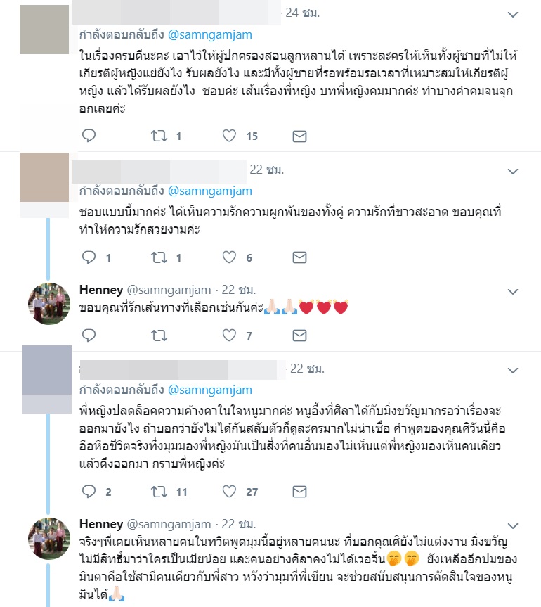 งานนี้ทำเอาแฟนละครต่างประทับใจและชื่นชมในความใส่ใจ นอกจากนี้ คุณหญิง ยังได้ตอบกลับคอมเมนต์ของแฟนละครเกี่ยวกับประเด็นดังกล่าวอีกด้วยว่า "ไม่ต้องห่วงค่ะ ไม่มีฉากนั้นในเรื่องนี้แน่นอนค่ะ"