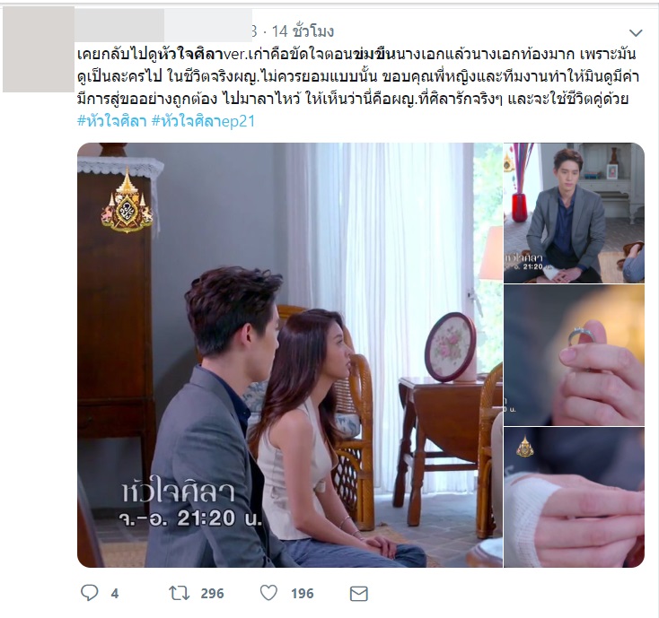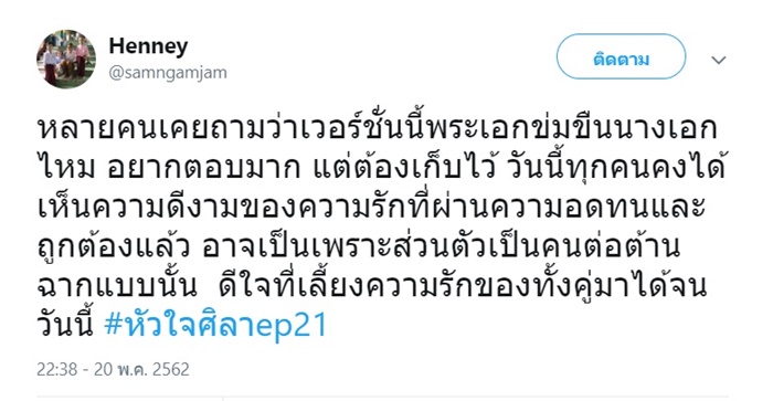 "หลายคนเคยถามว่าเวอร์ชั่นนี้พระเอกข่มขืนนางเอกไหม อยากตอบมาก แต่ต้องเก็บไว้ วันนี้ทุกคนคงได้เห็นความดีงามของความรักที่ผ่านความอดทนและถูกต้องแล้ว อาจเป็นเพราะส่วนตัวเป็นคนต่อต้านฉากแบบนั้น ดีใจที่เลี้ยงความรักของทั้งคู่มาได้จนวันนี้ #หัวใจศิลาep21"