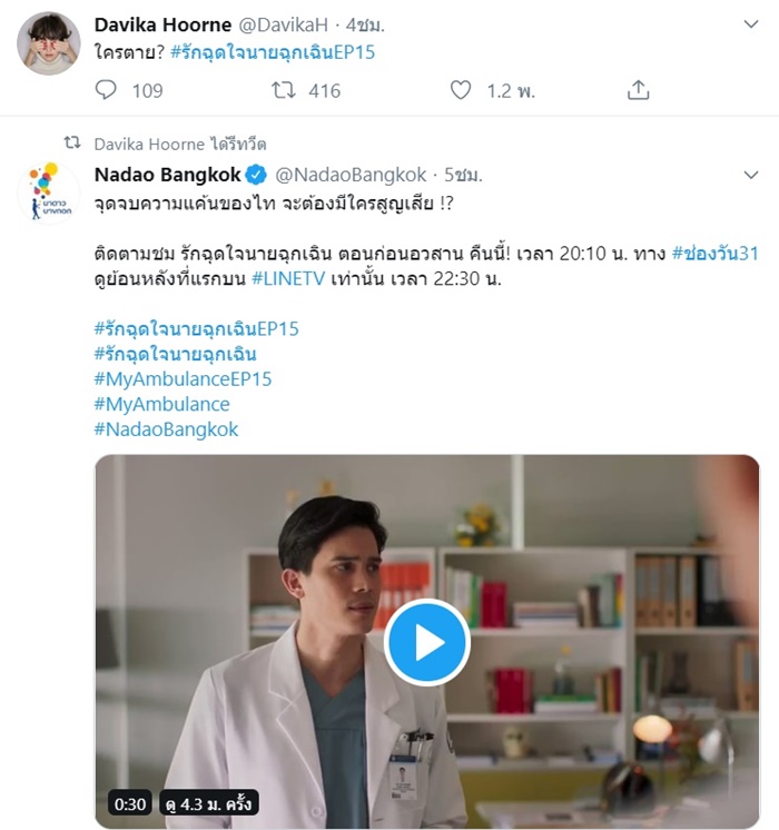 โดยสาว ใหม่ ดาวิกา นางเอกของเรื่องผู้รับบท "ทานตะวัน" ก็รีทวีตโพสต์ดังกล่าวเพื่อร่วมโปรโมตละคร รักฉุดใจนายฉุกเฉิน ก่อนจะโพสต์ข้อความว่า "ใครตาย ? #รักฉุดใจนายฉุกเฉินEP15"