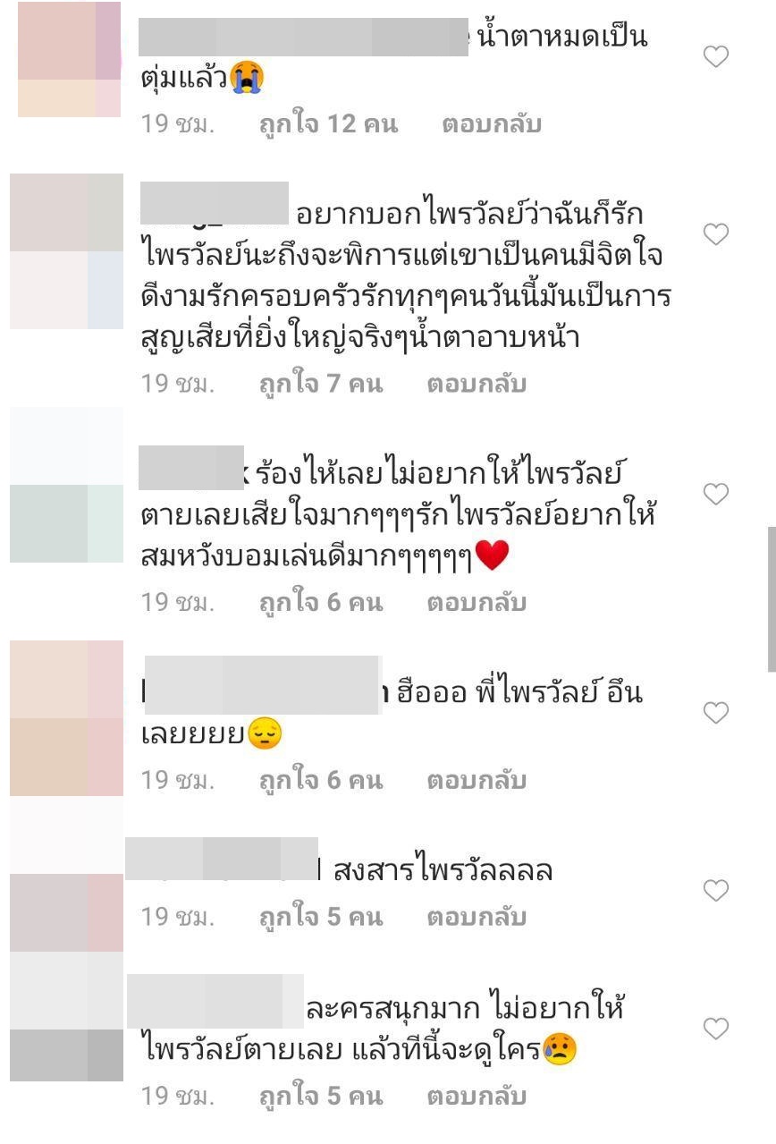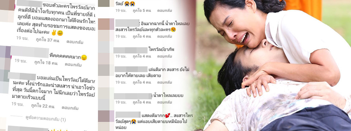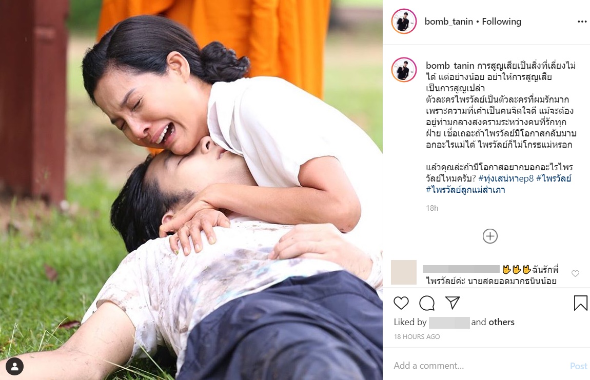 โดยล่าสุด (6 มีนาคม 2563) บอม ธนิน ก็ได้โพสต์เปิดใจ ส่งท้ายถึง "ไพรวัลย์" ลงใน IG ระบุว่า "การสูญเสียเป็นสิ่งที่เลี่ยงไม่ได้ แต่อย่างน้อย อย่าให้การสูญเสียเป็นการสูญเปล่า ตัวละครไพรวัลย์เป็นตัวละครที่ผมรักมาก เพราะความที่เค้าเป็นคนจิตใจดี แม้จะต้องอยู่ท่ามกลางสงครามระหว่างคนที่รักทุกฝ่าย เชื่อเถอะถ้าไพรวัลย์มีโอกาสกลับมาบอกอะไรแม่ได้ ไพรวัลย์ก็ไม่โกรธแม่หรอก แล้วคุณล่ะ ถ้ามีโอกาสอยากบอกอะไรไพรวัลย์ไหมครับ ? #ทุ่งเสน่หาep8 #ไพรวัลย์ #ไพรวัลย์ลูกแม่สำเภา"