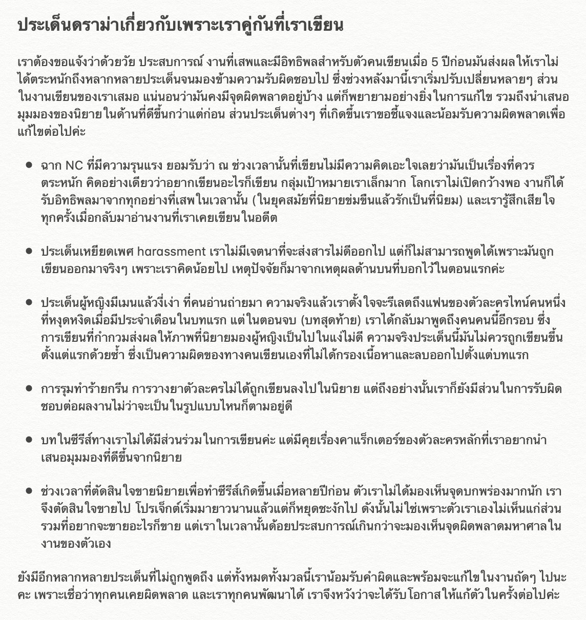 ซึ่งช่วงหลังมานี้เราเริ่มปรับเปลี่ยนหลาย ๆ ส่วน ในงานเขียนของเราเสมอ แน่นอนว่ามันคงมีจุดผิดพลาดอยู่บ้าง แต่ก็พยายามอย่างยิ่งในการแก้ไขรวมถึงนำเสนอมุมมองของนิยายในด้านที่ดีขึ้นกว่าแต่ก่อน ส่วนประเด็นต่าง ๆ ที่เกิดขึ้น เราขอชี้แจงและน้อมรับความผิดพลาดเพื่อแก้ไขต่อไปค่ะ"