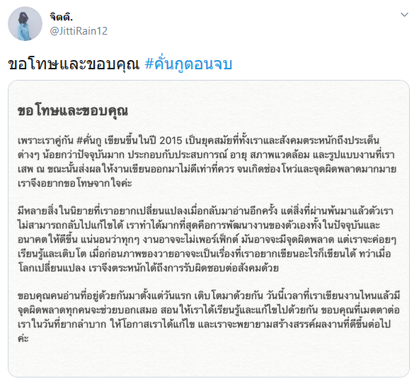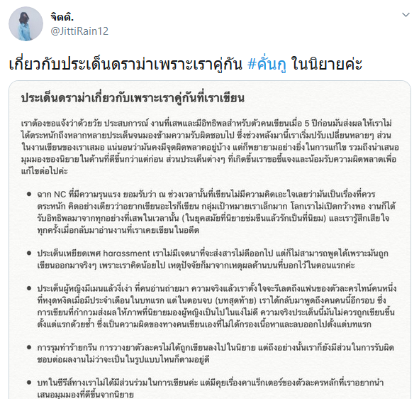 "เกี่ยวกับประเด็นดราม่าเพราะเราคู่กัน #คั่นกู ในนิยายค่ะ ประเด็นดราม่าเกี่ยวกับ เพราะเราคู่กัน ที่เราเขียน เราต้องขอแจ้งว่าด้วยวัยประสบการณ์งานที่เสพและมีอิทธิพลสำหรับตัวคนเขียนเมื่อ 5 ปีก่อน มันส่งผลให้เราไม่ได้ตระหนักถึงหลากหลายประเด็น จนมองข้ามความรับผิดชอบไป