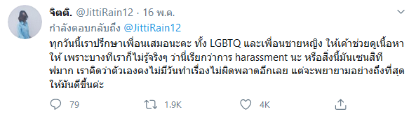 - ประเด็นเหยียดเพศ harassment เราไม่มีเจตนาที่จะส่งสารไม่ดีออกไป แต่ก็ไม่สามารถพูดได้ เพราะมันถูกเขียนออกมาจริง ๆ เพราะเราคิดน้อยไป เหตุปัจจัยก็มาจากเหตุผลด้านบนที่บอกไว้ในตอนแรกค่ะ