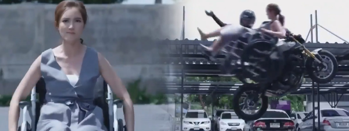 โดยเป็นฉากที่นางเอกของเรื่อง บัว นลินทิพย์ ถูกมือปืนตามฆ่า ซึ่งเจ้าตัวนั้นพิการและนั่งอยู่บนวีลแชร์ แต่ก็สู้กับมือปืนที่ขี่มอเตอร์ไซค์มาด้วยความเร็วสูง ก่อนนางเอกจะใช้แรงทำให้วีลแชร์บินเพื่อไปแย่งปืนกับมือปืนขณะลอยตัวอยู่กลางอากาศ แถมยังแย่งปืนมาได้สำเร็จ และยิงมือปืนจนบาดเจ็บ