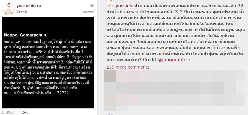 "จอดำ..... คำถามจากผมในฐานะผู้จัด ผู้กำกับ นักแสดง และสุดท้ายในฐานะประชาชนคนไทย ถาม กสท. กสทช. ศาลปกครอง ความว่า..... จะรีบจอดำไปทำไมครับในเมื่อ 1. โครงข่ายยังไม่สมบูรณ์เลยแม้แต่น้อย 2. สัญญาณส่งยังไม่ครอบคลุมทุกพื้นที่ในราชอาณาจักร 3. กล่องรับก็ยังไม่ได้แจก 4. ปัญหาในการแจกคูปองยังไม่มีการแจงรายละเอียดให้ผู้บริโภคได้รับรู้ 5. ประชาชนทราบมั้ยครับว่าเมื่อได้รับกล่องแล้วก็ยังดูไม่ได้จนกว่าจะติดตั้งเสารับสัญญาณ เสียเงินอีกราวพันกว่าบาท ผู้ชมที่มีฐานะยากจนจะได้รับแจกเงินส่วนนี้ด้วยมั้ยครับ 6. ผู้บริโภคควรมีสิทธิ์ในการเลือกรับชม..... แล้วจะรีบจอดำทำไมครับ.....?????"